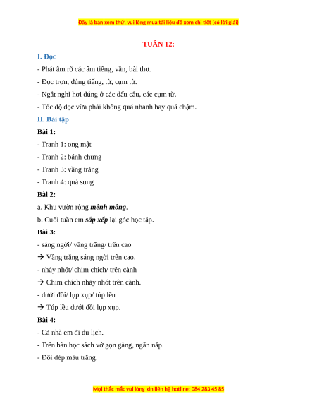 Môn: Tiếng Việt 1 (Chân trời sáng tạo) TUẦN 12 I. Đọc