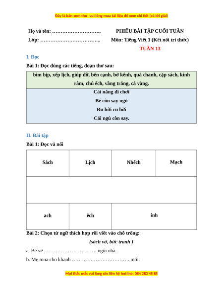 Môn: Tiếng Việt 1 (Kết nối tri thức) TUẦN 13 I. Đọc