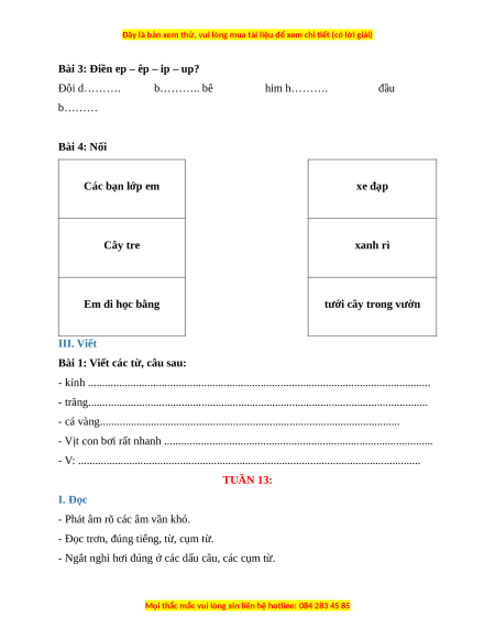 Bài 3: Điền ep – êp – ip – up? Đôi d………. b……….. bê him h………. đầu b……… Bài 4: Nối Các bạn lớp em xe đạp Cây tre xanh rì Em đi học bằng