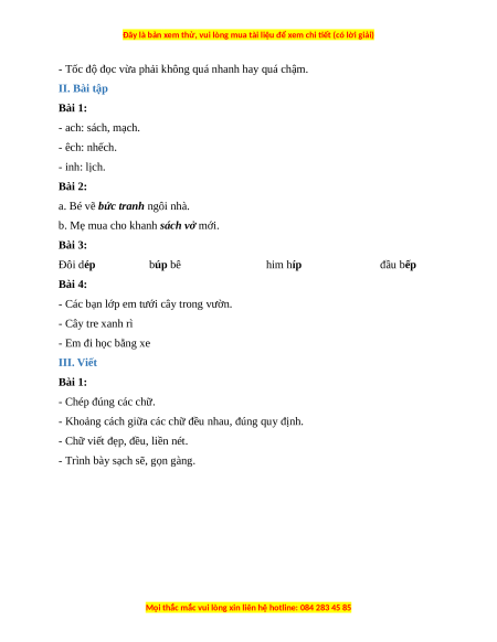 - Tốc độ đọc vừa phải không quá nhanh hay quá chậm. II. Bài tập Bài 1: - ach: sách, mạch. - êch: nhếch. - inh: lịch. Bài 2: