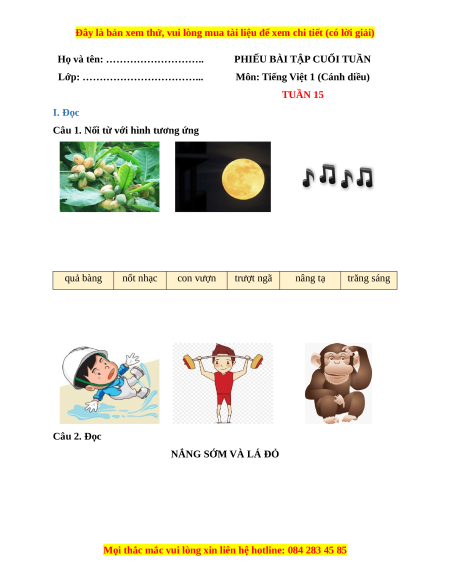 Câu 1. Nối từ với hình tương ứng quả bàng nốt nhạc con vượn trượt ngã nâng tạ trăng sáng Câu 2. Đọc