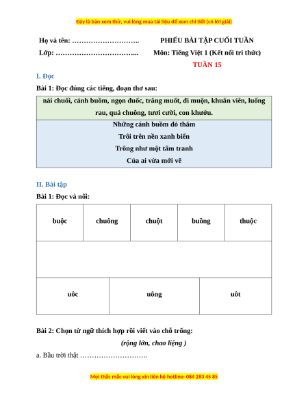 - Tốc độ đọc vừa phải không quá nhanh hay quá chậm. II. Bài tập Bài 1: - uôc: buộc, thuộc. - uông: chuông, buồng - uôt: chuột Bài 2: