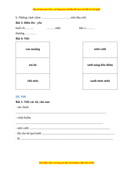 Bài 3: Điền iêu - yêu buổi ch……… …….. mến liêu x……… thương………… Bài 4: Nối: rau muống tươi cười em bé