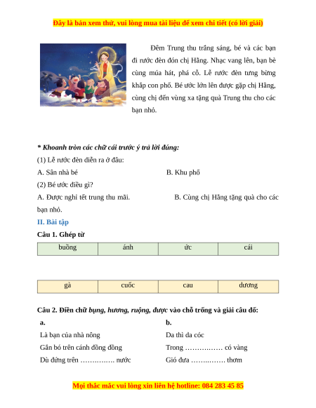 A. Được nghỉ tết trung thu mãi. B. Cùng chị Hằng tặng quà cho các bạn nhỏ. II. Bài tập Câu 1. Ghép từ buồng ánh ức cái gà cuốc cau dương