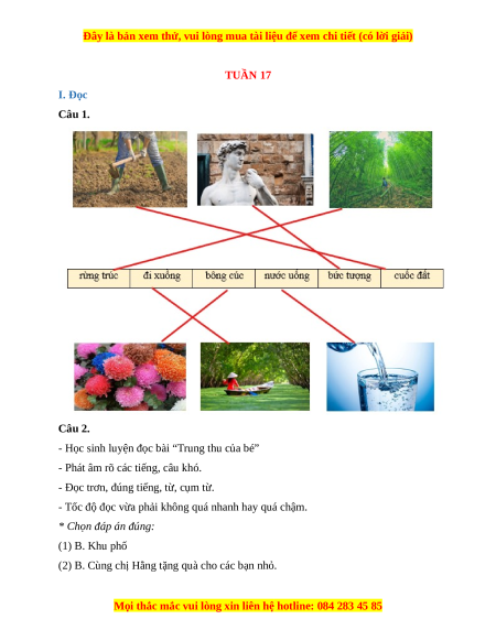 Câu 1. Đọc và nối ô chữ với hình rừng trúc đi xuồng bông cúc nước uống bức tượng cuốc đất Câu 2. Đọc TRUNG THU CỦA BÉ