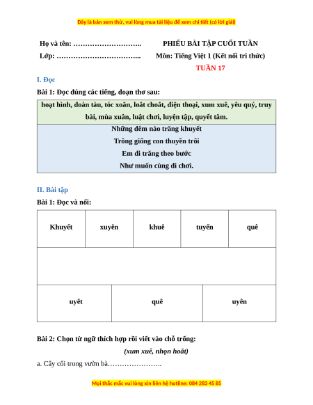 Môn: Tiếng Việt 1 (Kết nối tri thức) TUẦN 17 I. Đọc