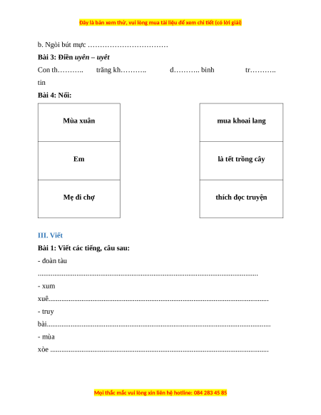 Bài 3: Điền uyên – uyêt Con th……….. trăng kh……….. d……….. binh tr……….. tin Bài 4: Nối: Mùa xuân mua khoai lang Em là tết trồng cây Mẹ đi chợ thích đọc truyện III. Viết