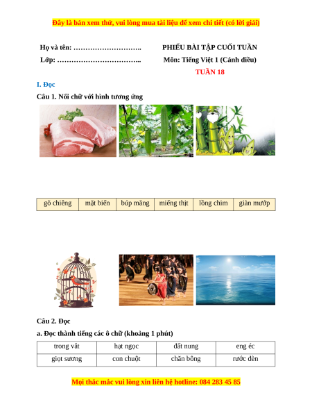Môn: Tiếng Việt 1 (Cánh diều) TUẦN 18 I. Đọc