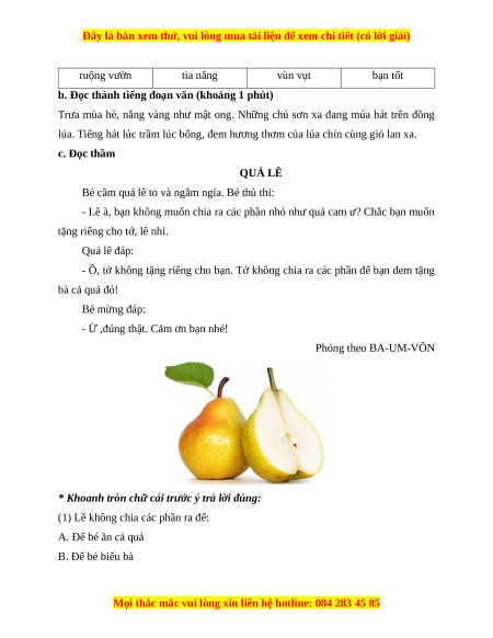 lúa. Tiếng hát lúc trầm lúc bổng, đem hương thơm của lúa chín cùng gió lan xa. c. Đọc thầm QUẢ LÊ