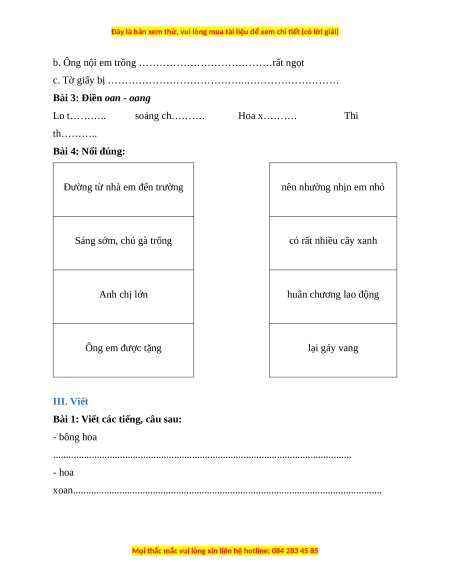 Bài 3: Điền oan - oang Lo t……….. soáng ch………. Hoa x………. Thi th……….. Bài 4: Nối đúng: