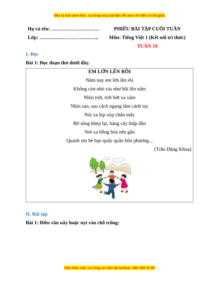 Bài 1: Đọc đoạn thơ dưới đây. EM LỚN LÊN RỒI Năm nay em lớn lên rồi