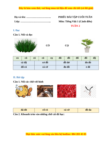 Câu 1. Nối và đọc CỎ CỌ co cò có cỏ cọ đô đồ đố đổ độ cá độ cơ đồ đồ dơ đo đỏ đổ cỏ cá cờ đo đồ e dè II. Bài tập