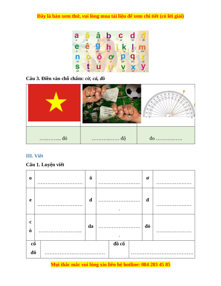 Câu 3. Điền vào chỗ chấm: cờ, cá, đồ …..……... đỏ ………..…… độ đo ……….…… III. Viết Câu 1. Luyện viết o ô ơ ……………………… ……………………. ………………… e d ……………………. đ ……………………… ………………… . c
