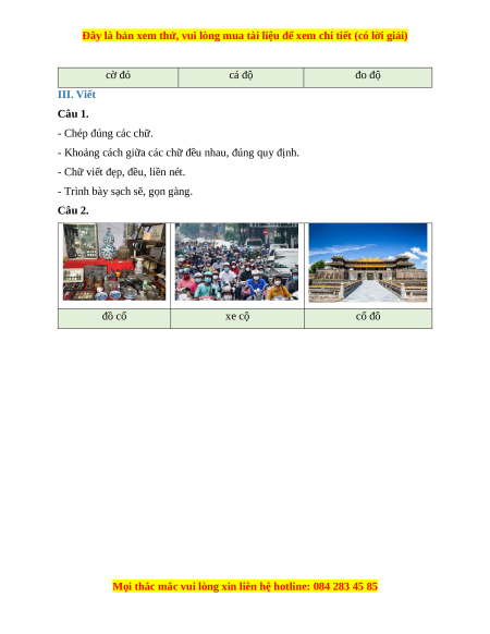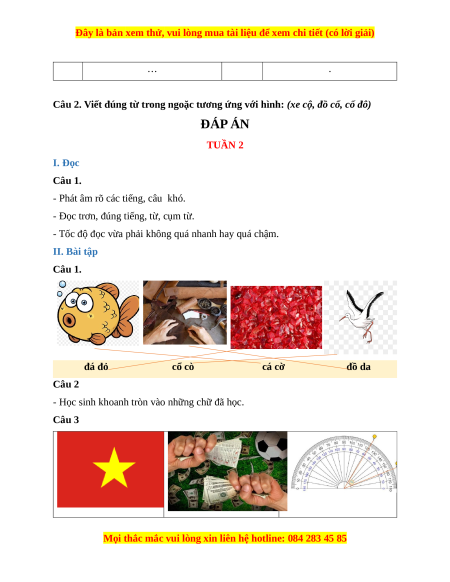Câu 2. Viết đúng từ trong ngoặc tương ứng với hình: (xe cộ, đồ cổ, cố đô) ĐÁP ÁN TUẦN 2 I. Đọc Câu 1.