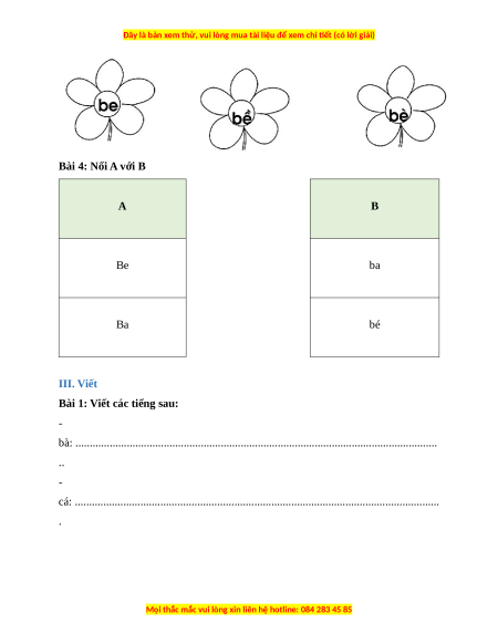 Bài 4: Nối A với B A B Be ba Ba bé III. Viết