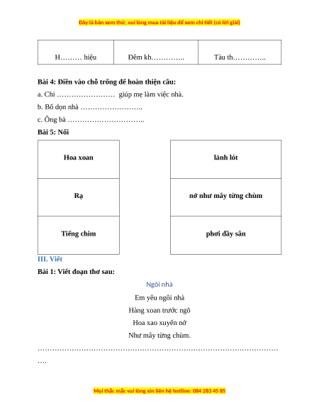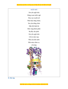 NGÔI NHÀ Em yêu ngôi nhà Hàng xoan trước ngõ Hoa xao xuyến nở Như mây từng chùm. Em yêu tiếng chim Đầu hồi lảnh lót Mái vàng thơm phức Rạ đầy sân phơi. Em yêu ngôi nhà Gỗ tre mộc mạc Như yêu đất nước Bốn mùa chim ca. (Tô Hà) II. Bài tập