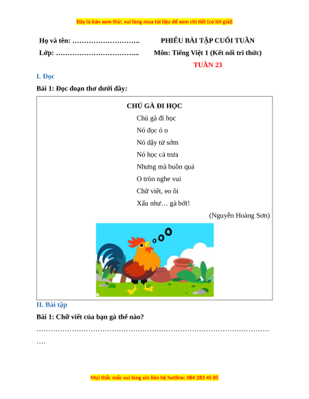 Bài 1: Đọc đoạn thơ dưới đây: CHÚ GÀ ĐI HỌC Chú gà đi học Nó đọc ó o Nó dậy từ sớm Nó học cả trưa Nhưng mà buồn quá O tròn nghe vui Chữ viết, eo ôi Xấu như… gà bới! (Nguyễn Hoàng Sơn) II. Bài tập