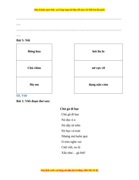 ……………………………………………………………………………………… …. Bài 5: Nối Bông hoa hót líu lo Chú chim nở rực rỡ Mẹ em đang nấu cơm III. Viết