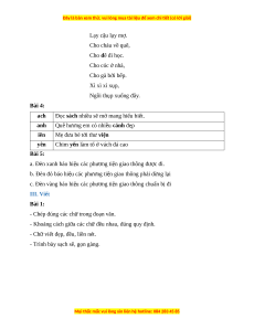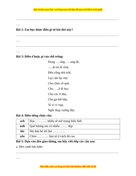 Bài 3: Điền d hoặc gi vào chỗ trống: Dung …..ăng …..ung dẻ, …..ắt trẻ đi chơi. Đến cổng nhà trời, Lạy cậu lạy mợ. Cho cháu về quê, Cho …..ê đi học. Cho cóc ở nhà, Cho gà bới bếp. Xì xì xì xụp, Ngồi thụp xuống đây.