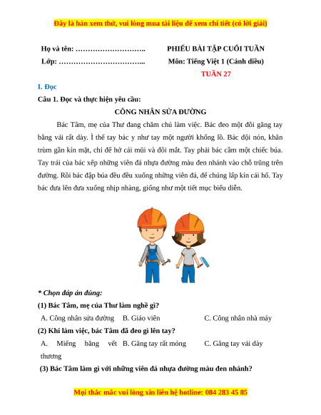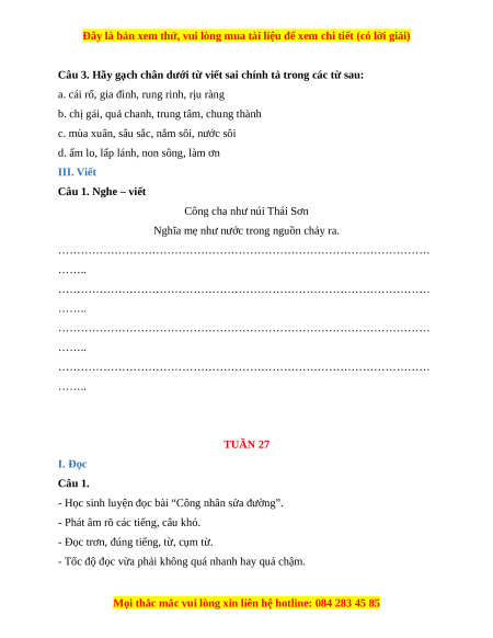 ……………………………………………………………………………………… …….. TUẦN 27 I. Đọc Câu 1.