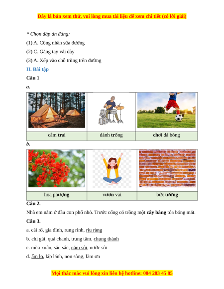 (3) A. Xếp vào chỗ trũng trên đường II. Bài tập Câu 1 a. cắm trại đánh trống chơi đá bóng b. hoa phượng vươn vai bức tường Câu 2.