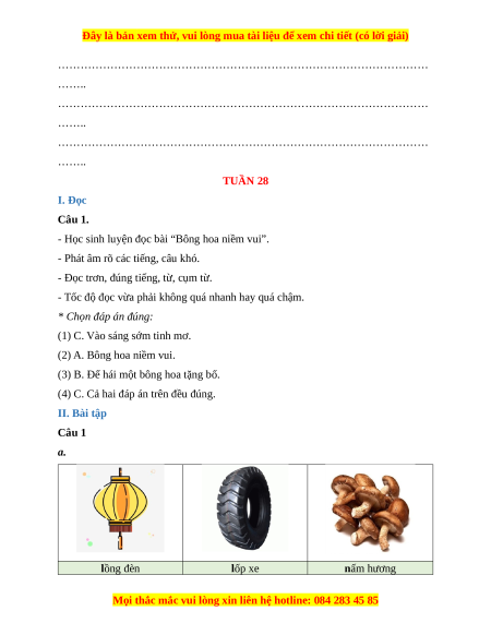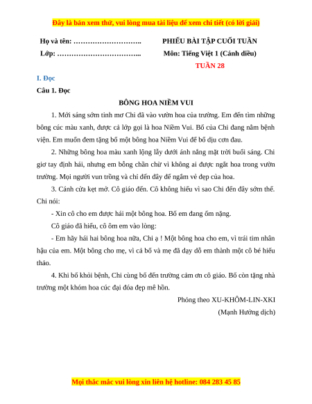 Môn: Tiếng Việt 1 (Cánh diều) TUẦN 28 I. Đọc Câu 1. Đọc BÔNG HOA NIỀM VUI