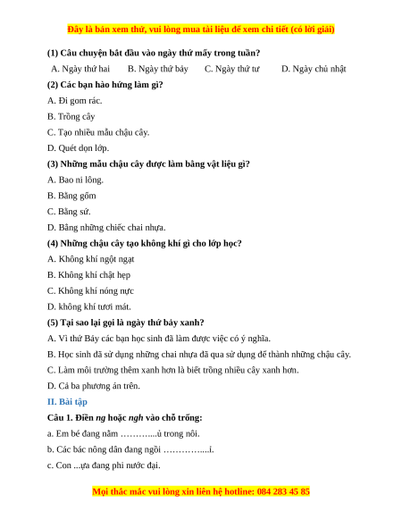 C. Làm môi trường thêm xanh hơn là biết trồng nhiều cây xanh hơn. D. Cả ba phương án trên. II. Bài tập