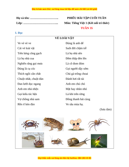 Môn: Tiếng Việt 1 (Kết nối tri thức) TUẦN 35 I. Đọc VÈ LOÀI VẬT Ve vẻ vè ve Đúng là anh dế Cái vè loài vật Suốt đời chậm trễ Trên lưng cõng gạch Là họ nhà sên Là họ nhà cua Đêm thắp đèn lên Nghiến răng gọi mưa Là cô đom đóm Đúng là cụ cóc Gọi người dậy sớm Thích ngồi cắn chắt Chú gà trống choai Chuột nhắt, chuột đàn Đánh hơi rất tài Đan lưới dọc ngang Anh em chú chó Anh em nhà nhện Mặt hay nhăn nhó Gọi kiểu tóc bện Là khỉ trên rừng Vợ chồng nhà sam Đồng thanh hát cùng Rền rĩ kéo đàn Ve sầu mùa hạ. (Sưu tầm)