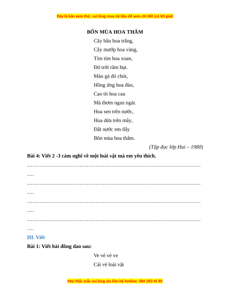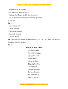 BỐN MÙA HOA THẮM Cây bầu hoa trắng, Cây mướp hoa vàng, Tím tím hoa xoan, Đỏ trời râm bụt. Mào gà đỏ chót, Hồng ửng hoa đào, Cao tít hoa cau Mà thơm ngan ngát. Hoa sen trên nước, Hoa dừa trên mây, Đất nước em đây Bốn mùa hoa thắm.