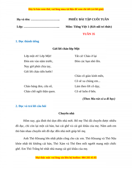 Môn: Tiếng Việt 1 (Kết nối tri thức) TUẦN 35