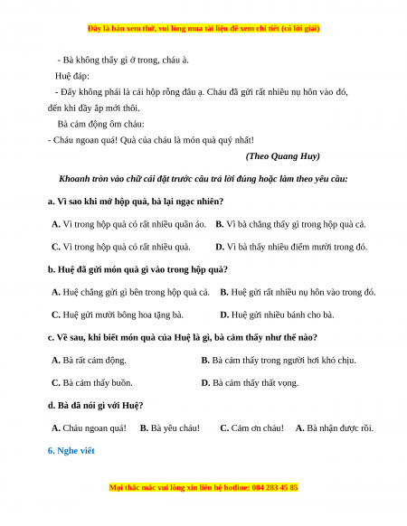 d. Bà đã nói gì với Huệ? A. Cháu ngoan quá! B. Bà yêu cháu! C. Cảm ơn cháu!