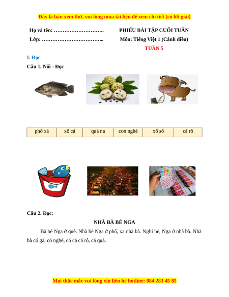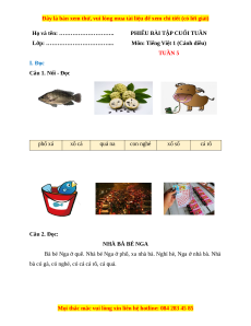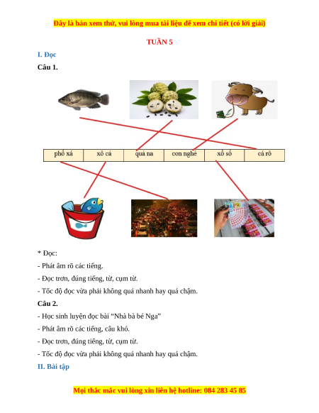 Môn: Tiếng Việt 1 (Cánh diều) TUẦN 5 I. Đọc Câu 1. Nối - Đọc phố xá xô cá quả na con nghé xổ số cá rô Câu 2. Đọc: NHÀ BÀ BÉ NGA