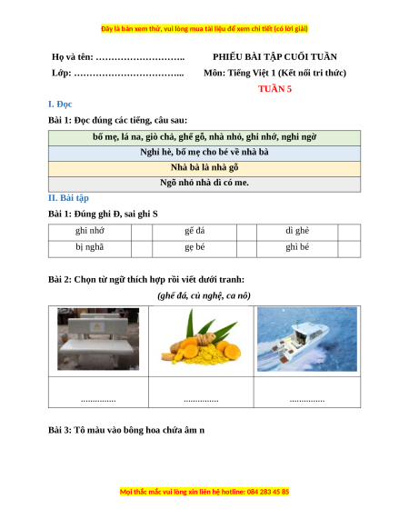 Môn: Tiếng Việt 1 (Kết nối tri thức) TUẦN 5 I. Đọc