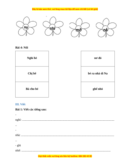 Bài 4: Nối Nghỉ hè nơ đỏ Chị bê bé ra nhà dì Na Bà cho bé ghế nhỏ III. Viết