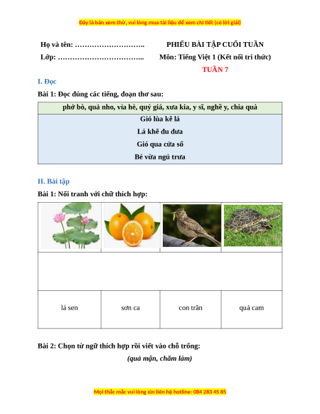 Môn: Tiếng Việt 1 (Kết nối tri thức) TUẦN 7 I. Đọc