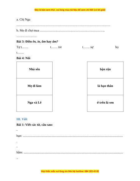 Bài 3: Điền ên, in, ăm hay âm? Tự t…… t…… tre t…… sự họ t…… Bài 4: Nối Nhà sên bận rộn Mẹ đi làm là bạn thân Nga và Lê ở trên lá sen III. Viết