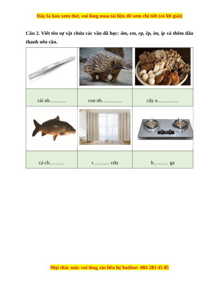 Câu 2. Viết tên sự vật chứa các vần đã học: âm, em, ep, êp, im, ip và thêm dấu thanh nếu cần. cái nh………. con nh………… cây n……….… cá ch……… r…….… cửa b……… ga