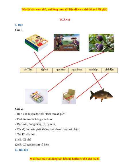 Câu 1: Nối chữ với hình cô Tấm tập vở quả sim que kem cá chép ghế đệm Câu 2: Đọc: BỮA TRƯA Ở QUÊ