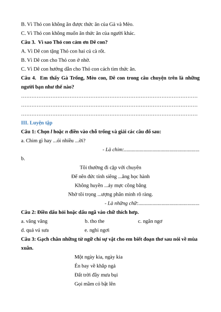 Câu 2: Điền dấu hỏi hoặc dấu ngã vào chữ thích hơp. a. văng văng b. tho the c. ngân ngơ d. quả vú sưa e. nghi ngơi