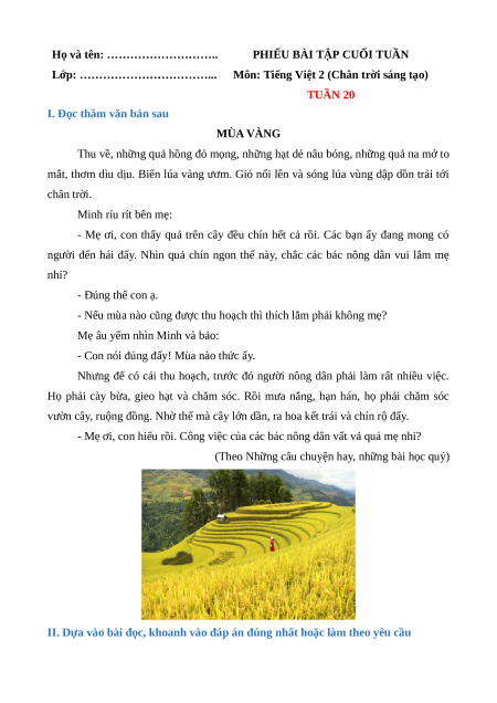 PHIẾU BÀI TẬP CUỐI TUẦN