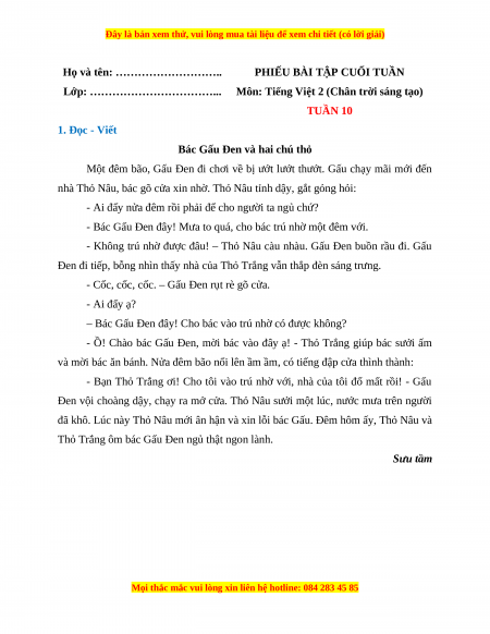 Môn: Tiếng Việt 2 (Chân trời sáng tạo) TUẦN 10 1. Đọc - Viết