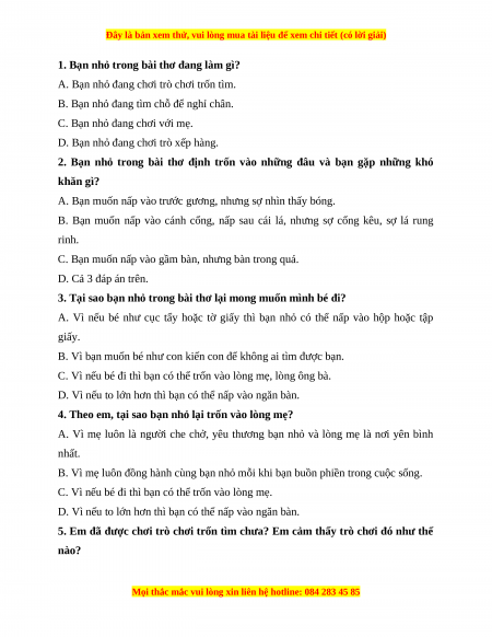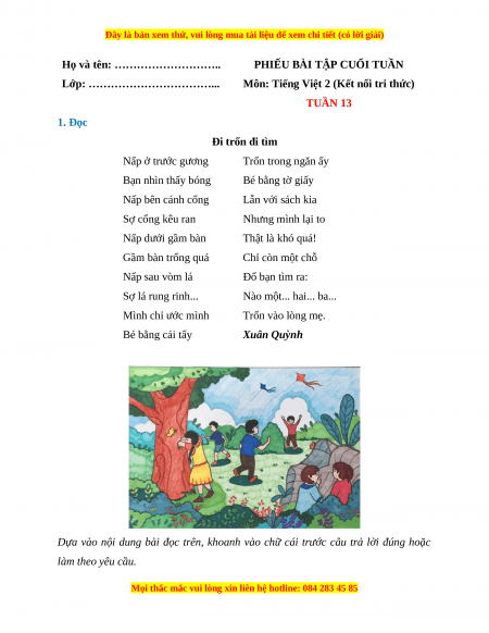 Môn: Tiếng Việt 2 (Kết nối tri thức) TUẦN 13 1. Đọc Đi trốn đi tìm Nấp ở trước gương Trốn trong ngăn ấy Bạn nhìn thấy bóng Bé bằng tờ giấy Nấp bên cánh cổng Lẫn với sách kia Sợ cổng kêu ran Nhưng mình lại to Nấp dưới gầm bàn Thật là khó quá! Gầm bàn trống quá Chỉ còn một chỗ Nấp sau vòm lá Đố bạn tìm ra: Sợ lá rung rinh... Nào một... hai... ba... Mình chỉ ước mình Trốn vào lòng mẹ. Bé bằng cái tẩy Xuân Quỳnh