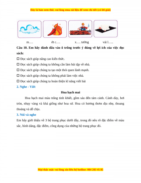 Câu 10. Em hãy đánh dấu vào ô trống trước ý đúng về lợi ích của việc đọc sách: