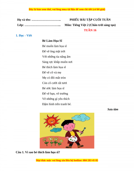 Môn: Tiếng Việt 2 (Chân trời sáng tạo) TUẦN 16 1. Đọc - Viết Bé Làm Họa Sĩ Bé muốn làm họa sĩ Để vẽ ông mặt trời Với những tia nắng ấm Sáng rực khắp muôn nơi Bé thích làm họa sĩ Để vẽ cô và mẹ Mẹ có đôi mắt tròn Còn cô cười rất tươi Bé ước làm họa sĩ