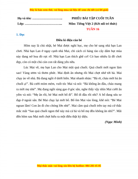 Môn: Tiếng Việt 2 (Kết nối tri thức) TUẦN 16 1. Đọc