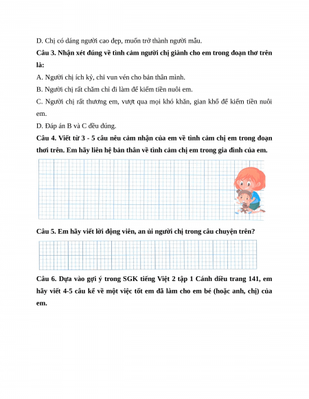 Câu 3. Nhận xét đúng về tình cảm người chị giành cho em trong đoạn thơ trên