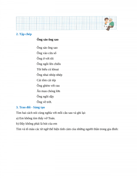b) Khi đàn vịt của ông (bà) vừa bị chết bởi trận dịch cúm gia cầm. 2. Tập chép Ông sảo ông sao Ông sảo ông sao Ông vào cửa sổ Ông ở với tôi Ông ngồi lên chiếu Tôi biếu củ khoai Ông nhai nhóp nhép Cái tôm cái tép Ông ghém với rau Ăn mau chóng lớn Ông ngồi dậy Ông về trời.