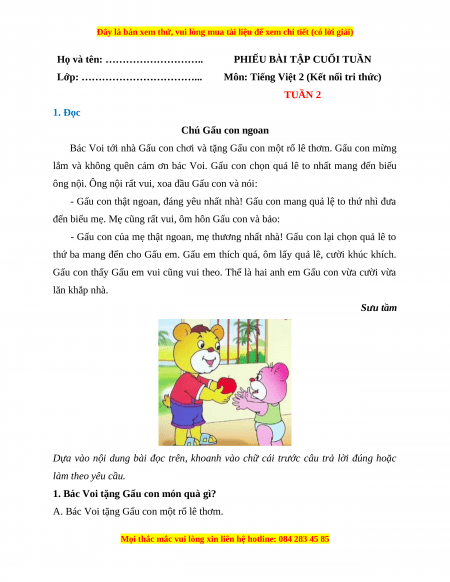 - Tailieugiaovien.com.vn giới thiệu phiếu bài tập cuối tuần môn Tiếng việt lớp 2 bộ Kết nối tri thức mới nhất năm 2023 nhằm giúp Giáo viên có thêm tài liệu tham khảo Tiếng việt lớp 2.