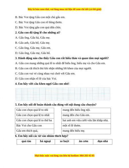 1. Đáp án: A. Bác Voi tặng Gấu con một rổ lê thơm.