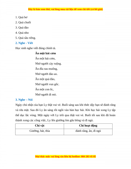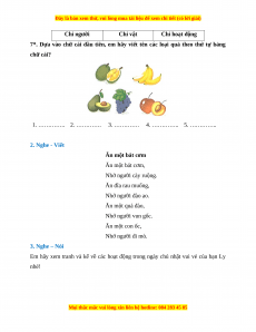 4. ………….. 5. ………….. 2. Nghe - Viết Ăn một bát cơm Ăn một bát cơm, Nhớ người cày ruộng. Ăn đĩa rau muống, Nhớ người đào ao. Ăn một quả đào, Nhớ người vun gốc. Ăn một con ốc, Nhớ người đi mò. 3. Nghe – Nói
